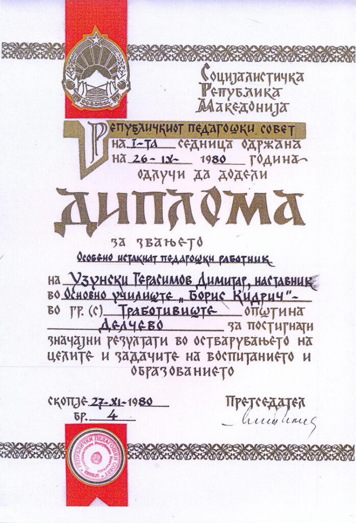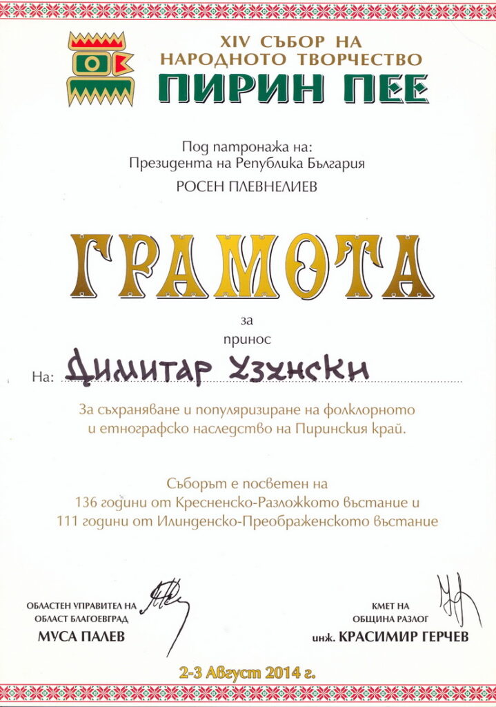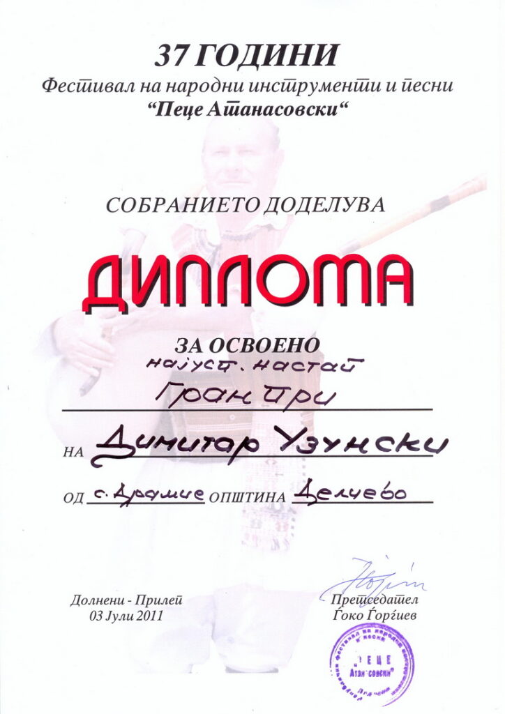 -Признанието за животно дело доделено од Градоначалникот на Општина Делчево во 2012 година,