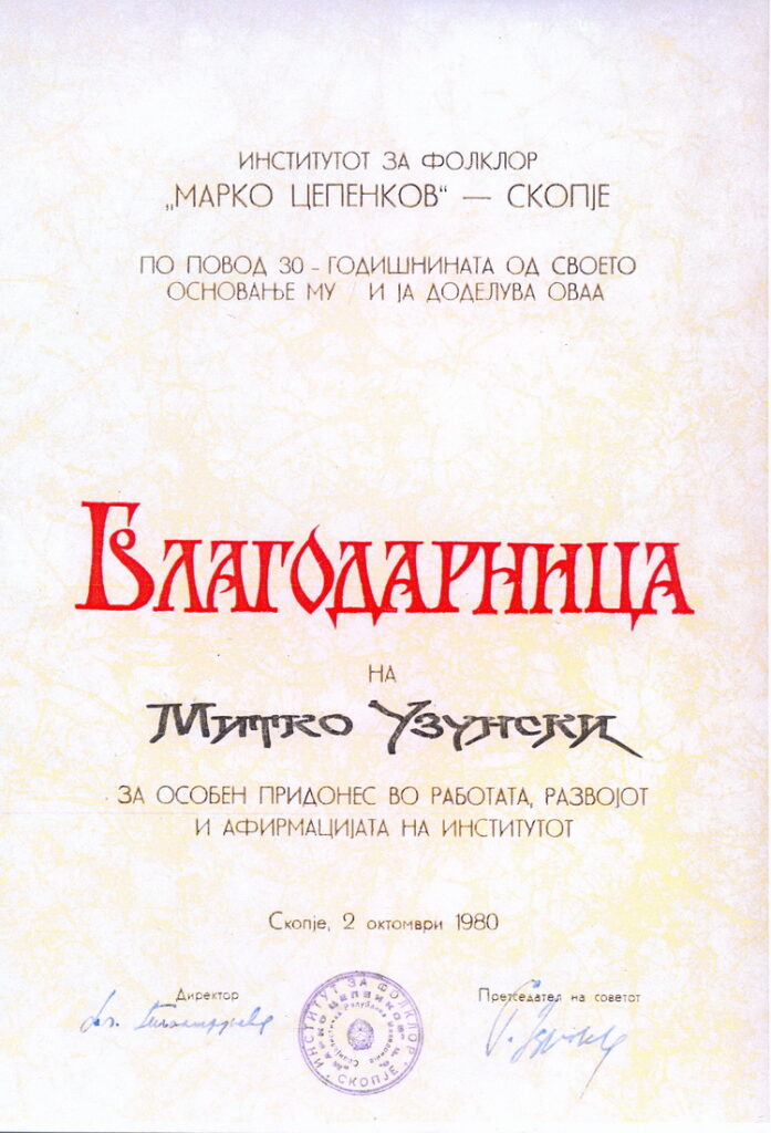 1967 год. Институтот за фолклор на Р.Македонија ќе го ангажира за надворешен соработник. Тоа ќе го прими со задоволство и набргу ќе ја добие првата награда на распишаниот конкурс за собирачка активност од страна на Институтот за Фолклор и весникот „Просвета“.