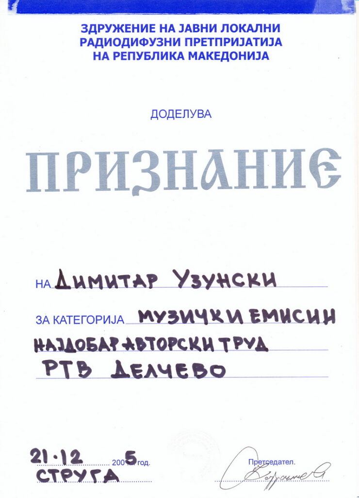 -Наградата “Најдоброто од истокот” која ја доделува Регионалниот центар од Источниот (Брегалнички) регион на Здружението на новинари на Македонија.