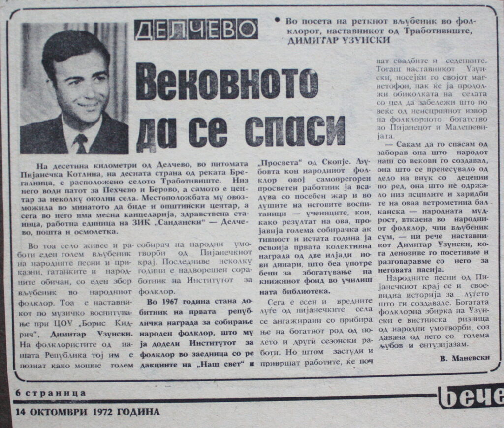 Тоа ќе го охрабри и од тогаш, па до денес, тој е неуморен собирач на пијанечкиот фолклор и еден од најдобрите современи собирачи на македонскиот фолклор.
