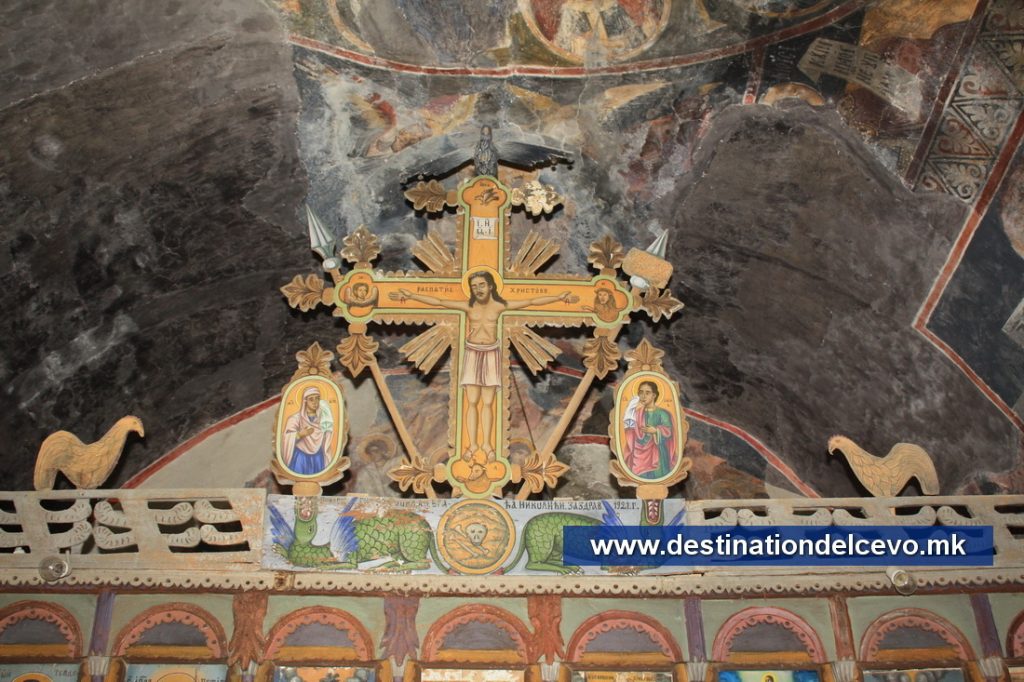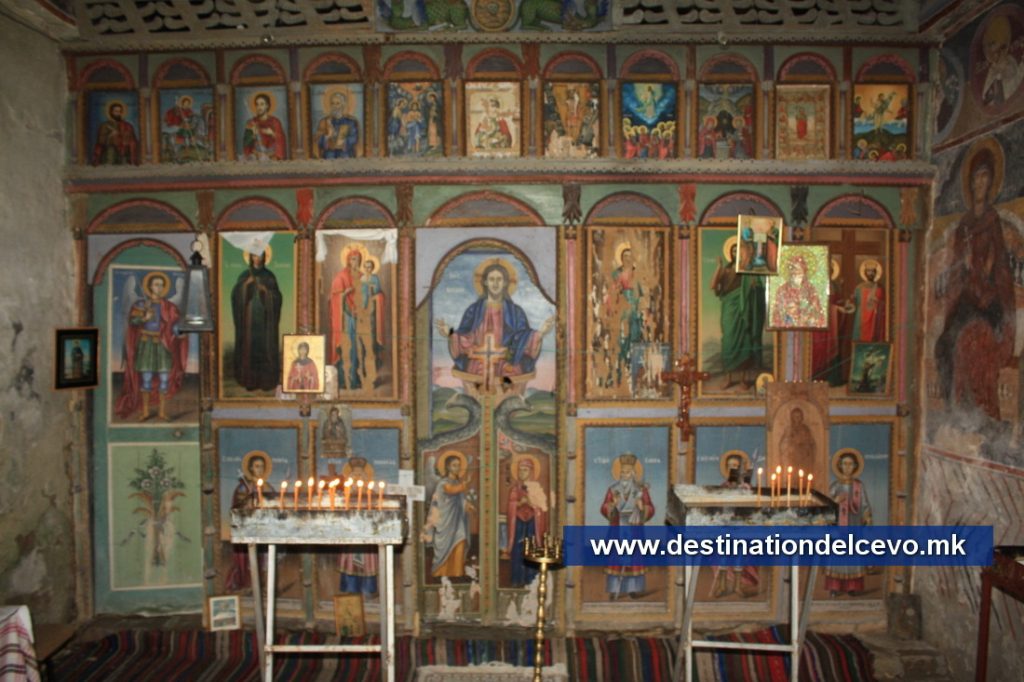 Иконостас: Св. Двери со благовештение и дрвен крст на нив и завеса со икона Исус Христос Седржител. Во долниот ред десно од Дверите се Св. Сава, Св. Димитар и Св. Арх Стефан на кои стои 1921 година. Лево од дверите се Св. Никола и Св. Георги. На северната страна постои врата за влез во олтарот со икона на Св.Архангел Михаил. На вториот ред десно се иконите Исус Христос и Св. Јован Крстител, Цар Константин и Царица Елена. Лево од дверите се Св. Богородица и Св. Петка.